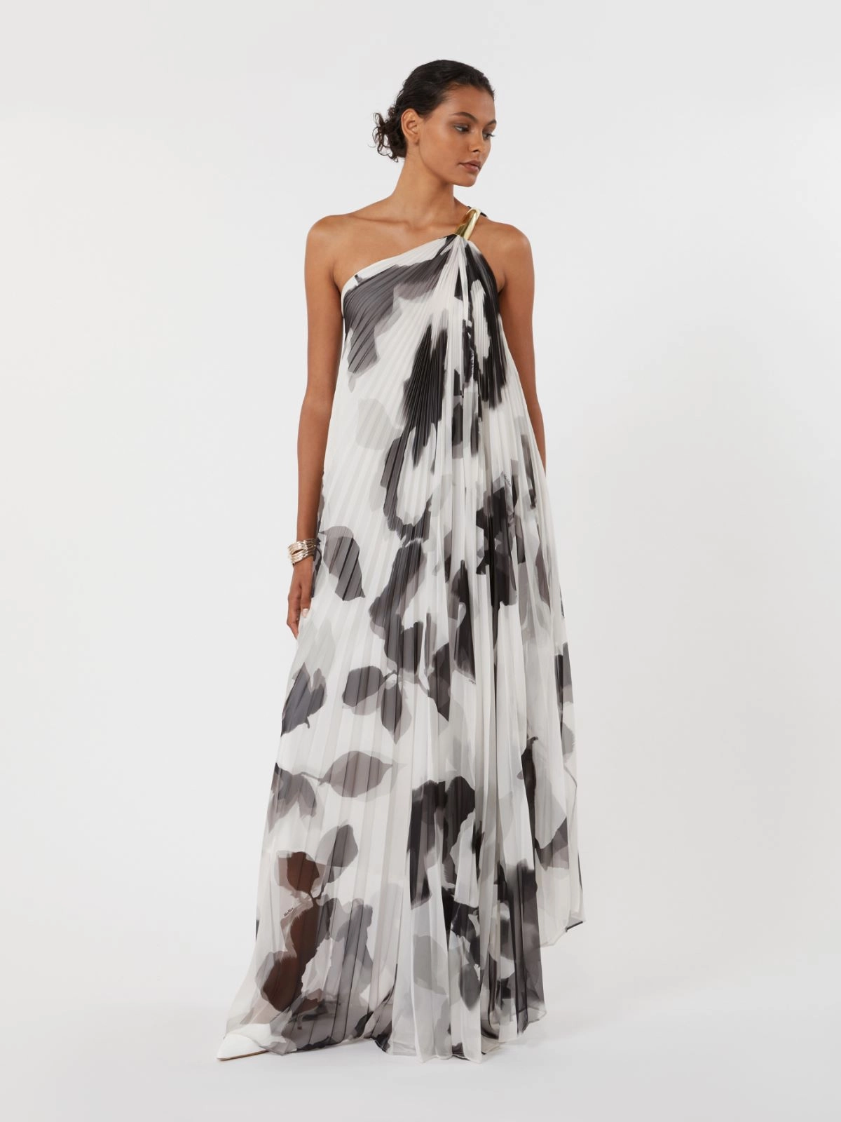 Long one-shoulder dress featuring an all-over plissé-pleated pattern for soft and fluid movement.