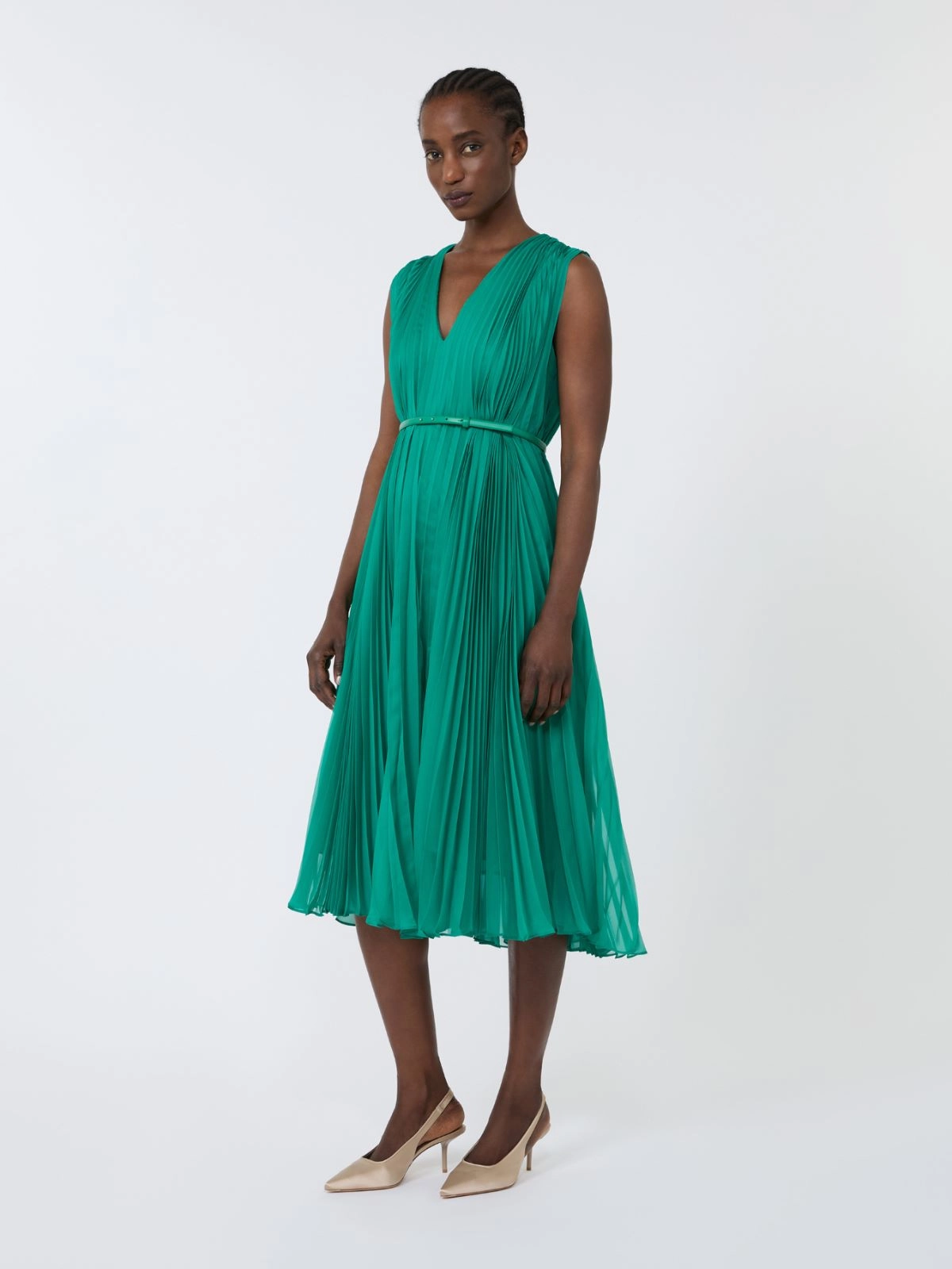 Sleeveless midi dress with matching belt to wear at the waist to accentuate the silhouette or inserted only on the front to create a cape effect on the back.