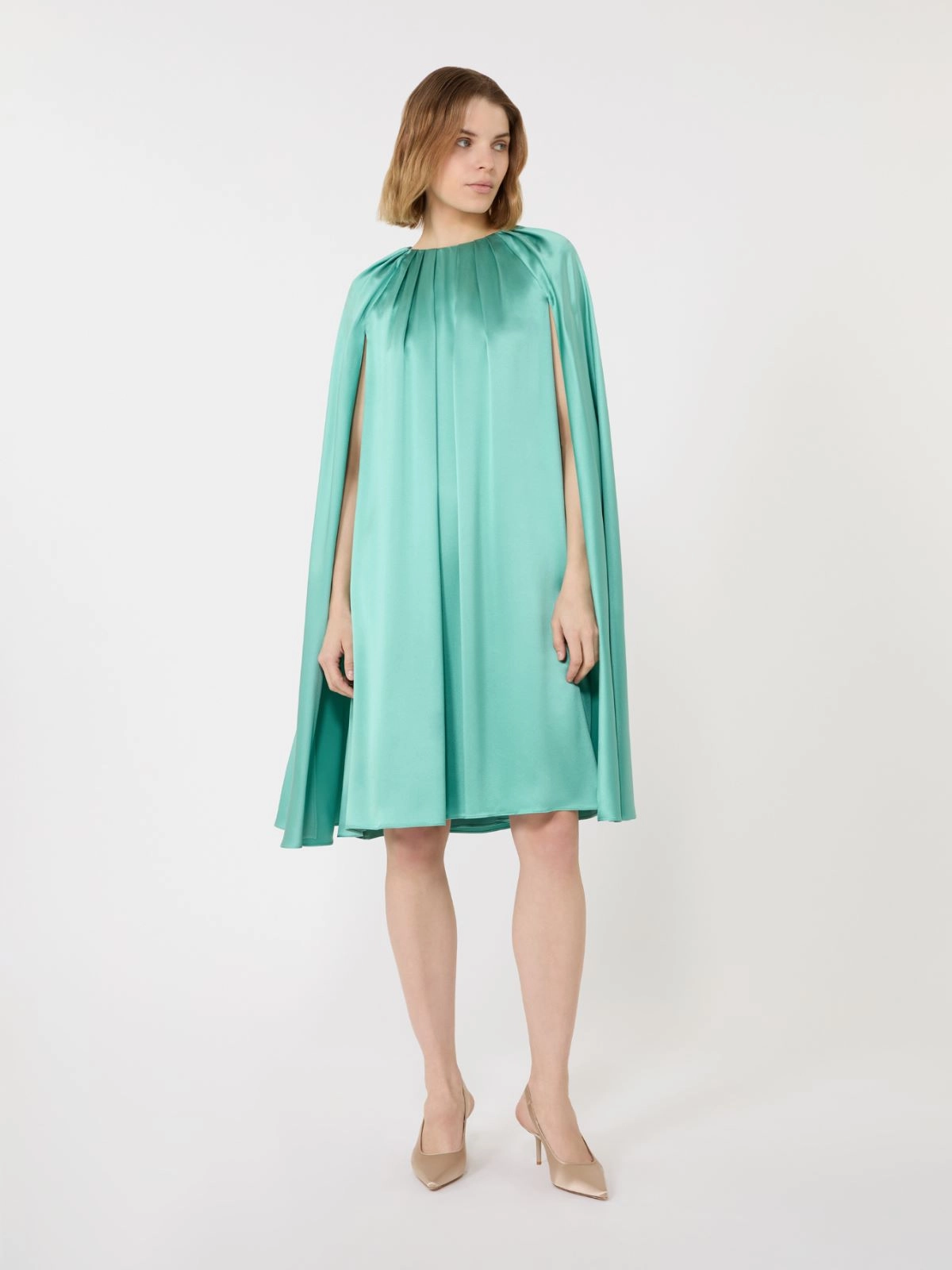 Short A-line dress featuring arm-covering cape detail that fastens at the back by means of bejewelled aglet-adorned thin ties.