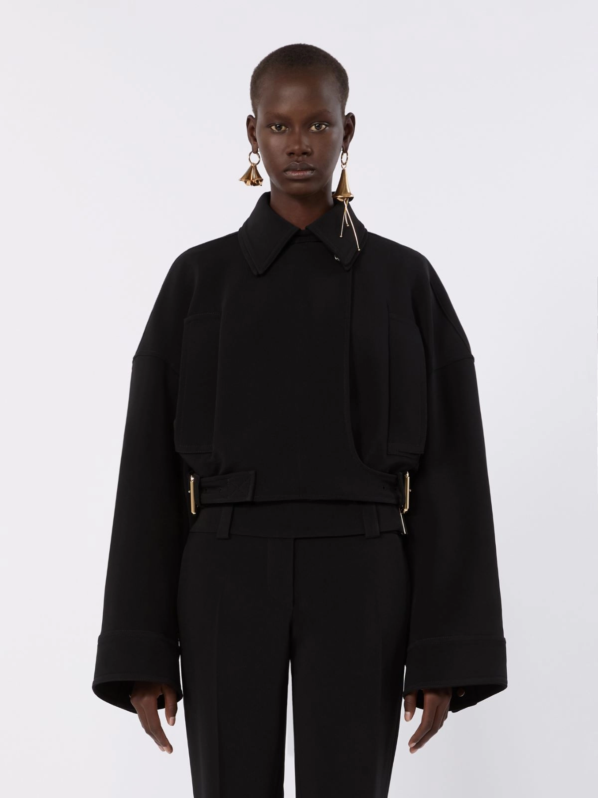 Relaxed-fit short drop-shoulder jacket in stretch viscose cady fabric. The detachable double fabric collar allows for an adjustable styling. Concealed zip and side buckle fastening at the waist. Metal press studs on the cuffs.