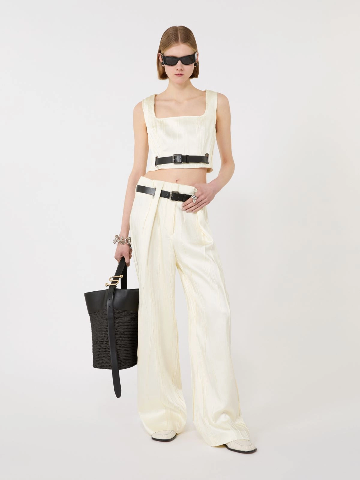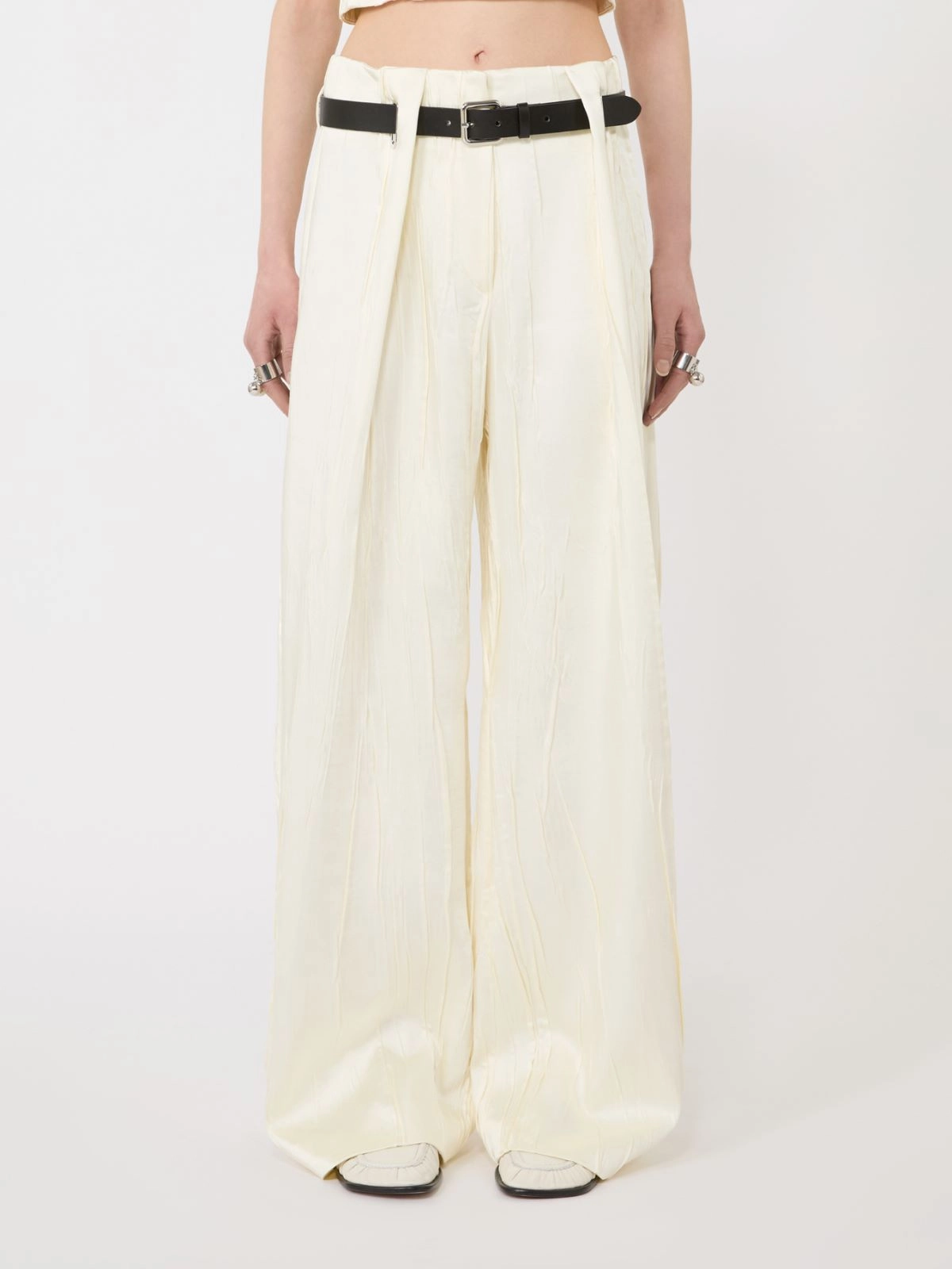 - Trousers in plissé-pleated bonded technical satin fabric