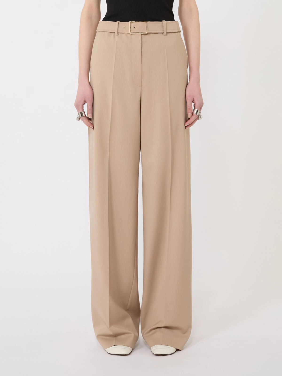 Stretch gabardine wool trousers with a tailored feel and soft volume. The waist is accentuated by thebelt with metal buckle. Trouser crease front and back.