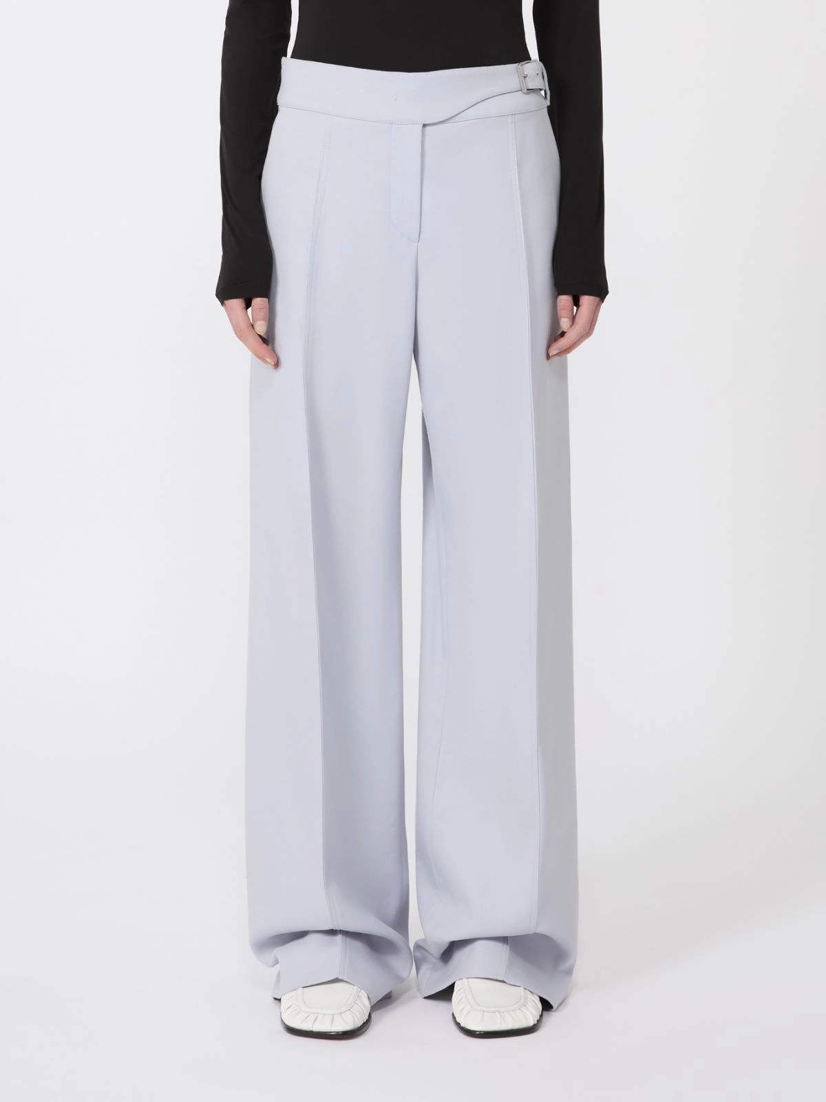 New trousers with a wide volume on the leg and a stitched rib on the front that visually elongates the silhouette. The waist is decorated with an asymmetrical yoke and metal buckle. Denim-effect patch pockets complete the back.