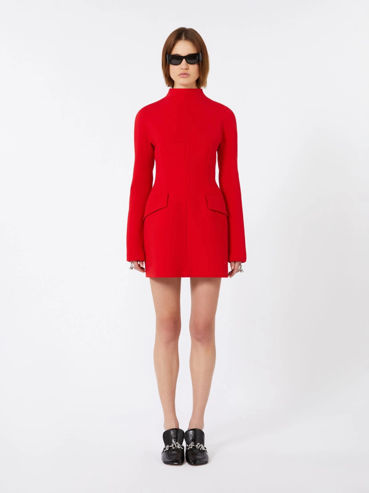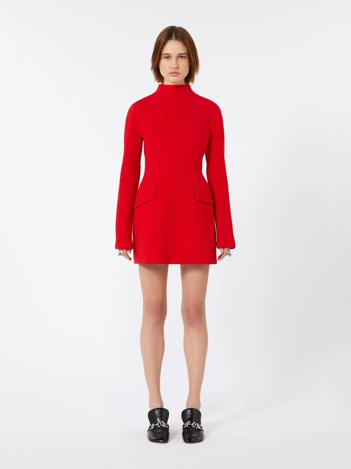 Hourglass-shaped dress with a high neck and fitted waist. The deep darts and seams on the centre-front and centre-back create a rounded succession of feminine lines over the hips. - Stretch tech double gabardine wool dress - Hourglass line, fitted at the waist and rounded at the hips - Stand collar with centre back zip and kimono-cut sleeves - Deep darts at front and back - Side pockets with flaps - Fitted waist