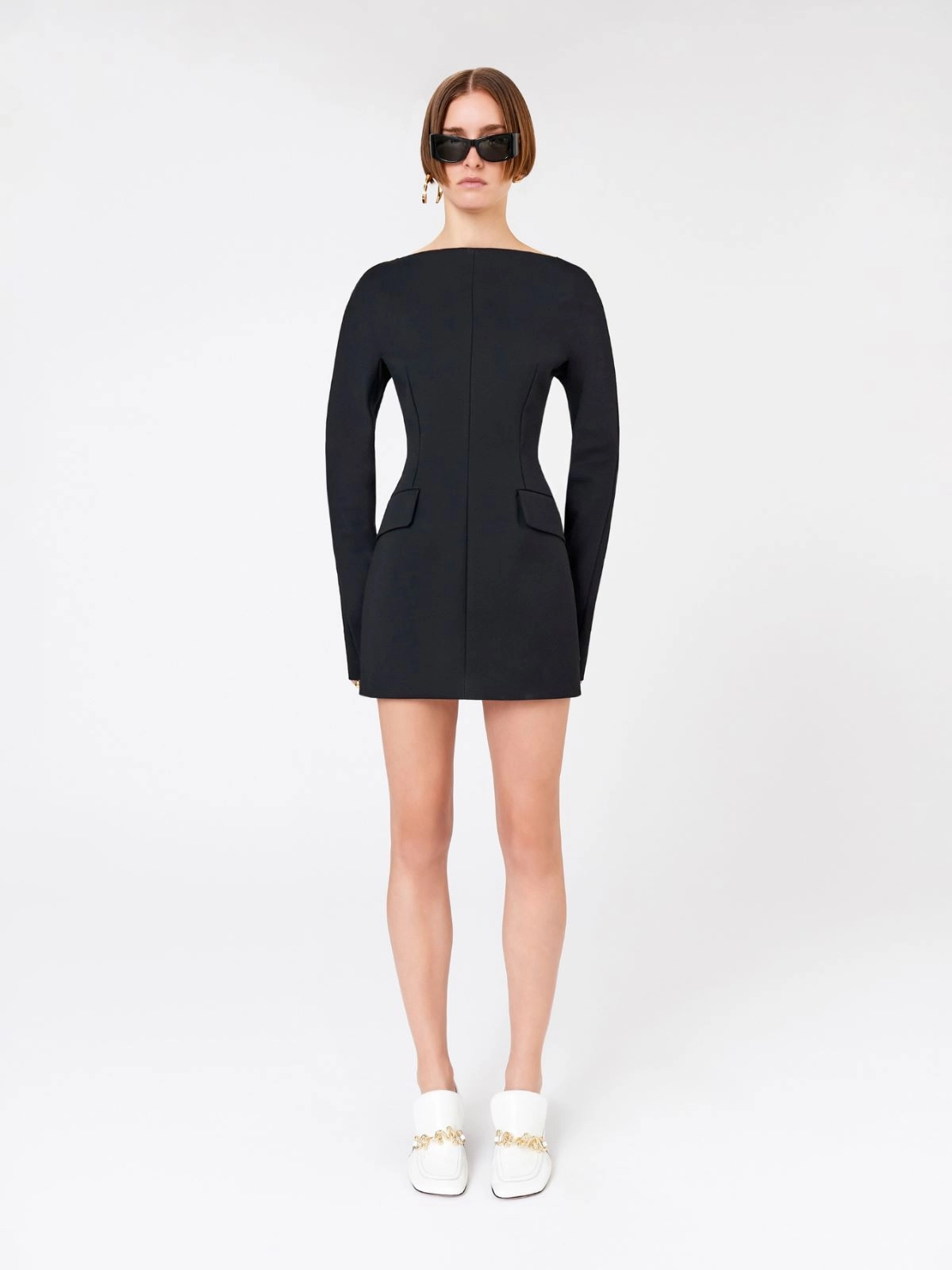 Long-sleeved dress with an hourglass silhouette, made of cotton double cady. The central seams and deep darts accentuate the silhouette, with rounded hips and flap pockets. The straight neckline that continues over the shoulders, with small fabric shoulder straps.