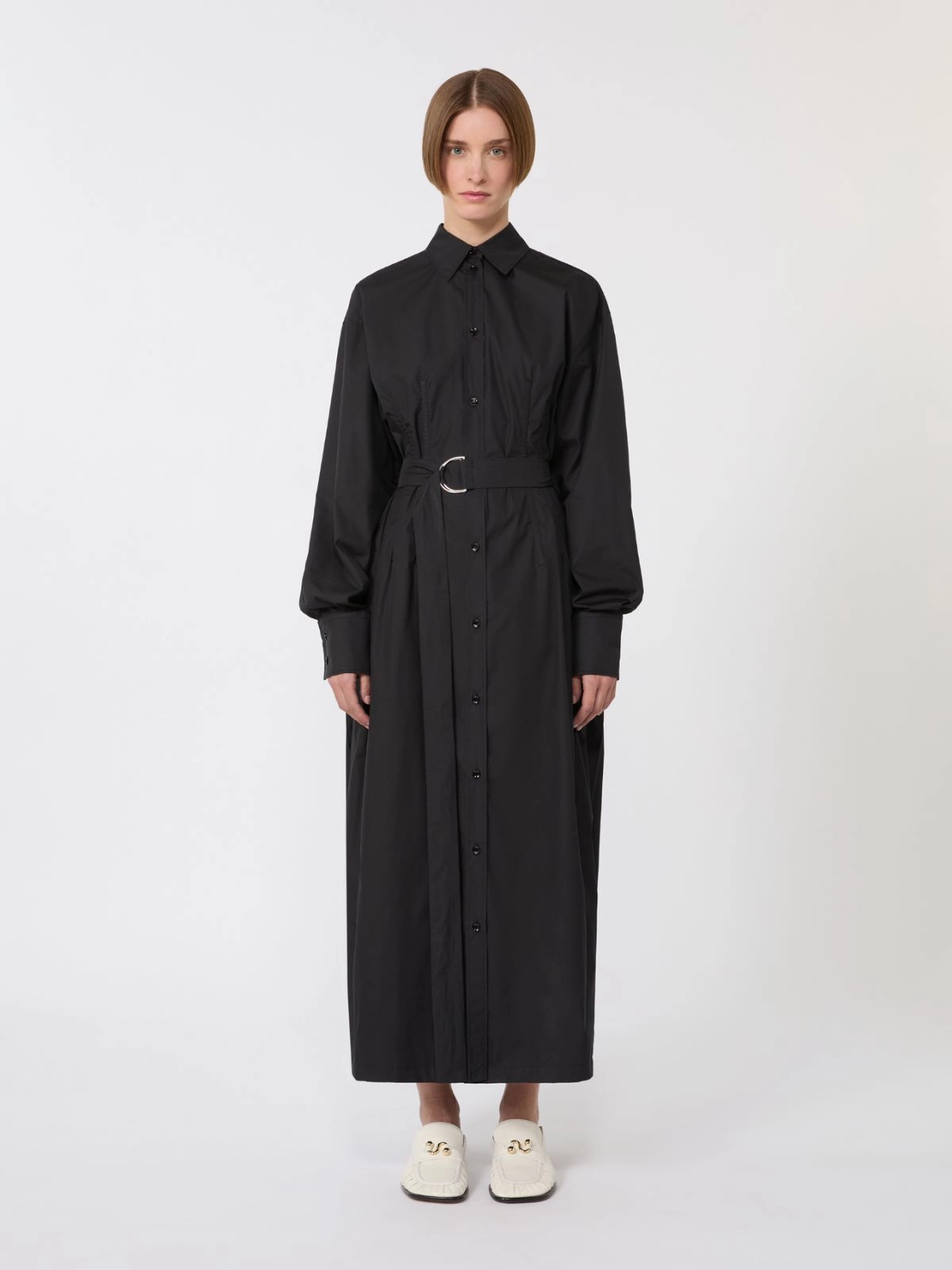 Shirt dress in technical cotton canvas, with regular lines on the bodice and visible buttoning. The waist is highlighted by the belt with double metal ring, which only pulls in the front part. Back with pleated insert that moves freely.