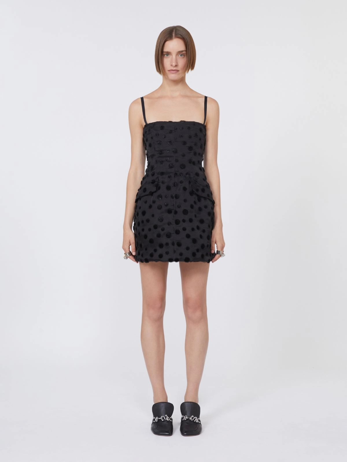 - Lined dress in double silk organza fabric featuring flocked polka dots