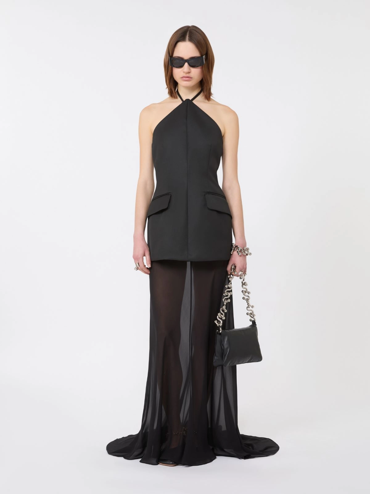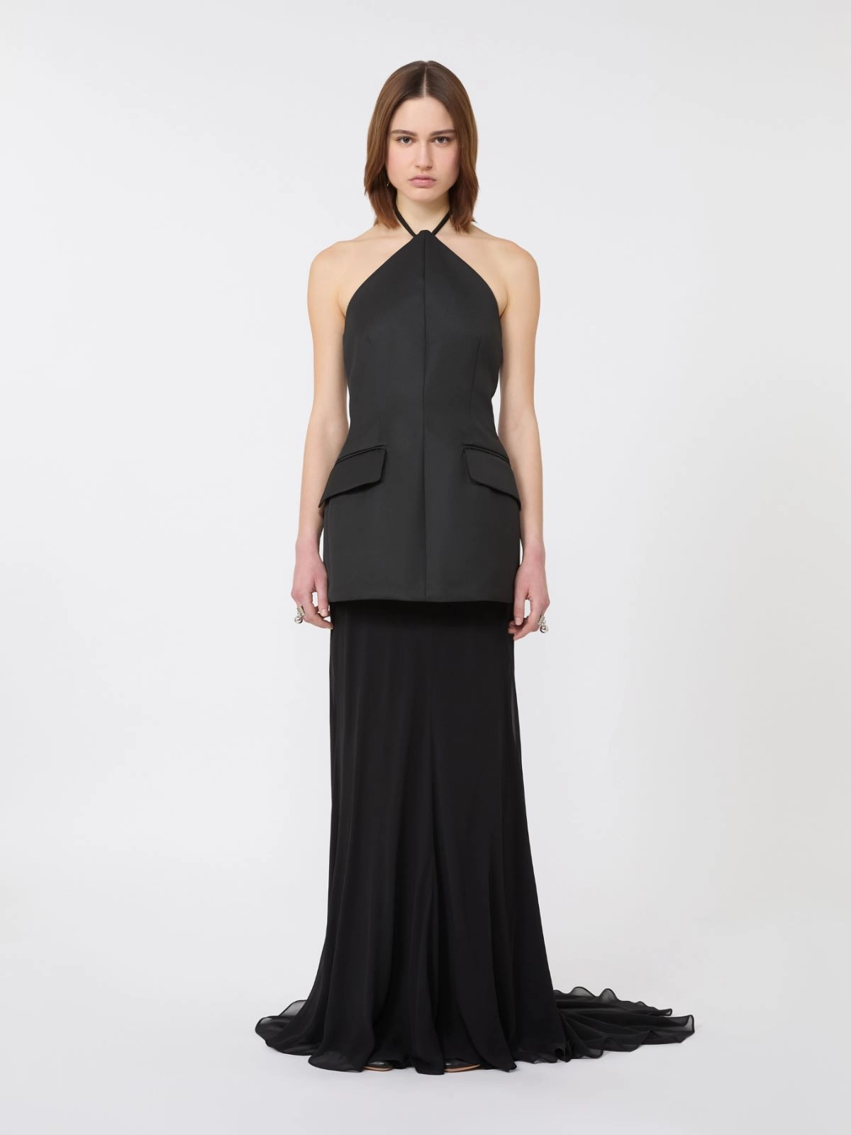 Designed for the most glamorous evenings, this dress features an hourglass bodice with a halter neckline and a flared georgette skirt with a train and eyelet so you can hold it in your hand.