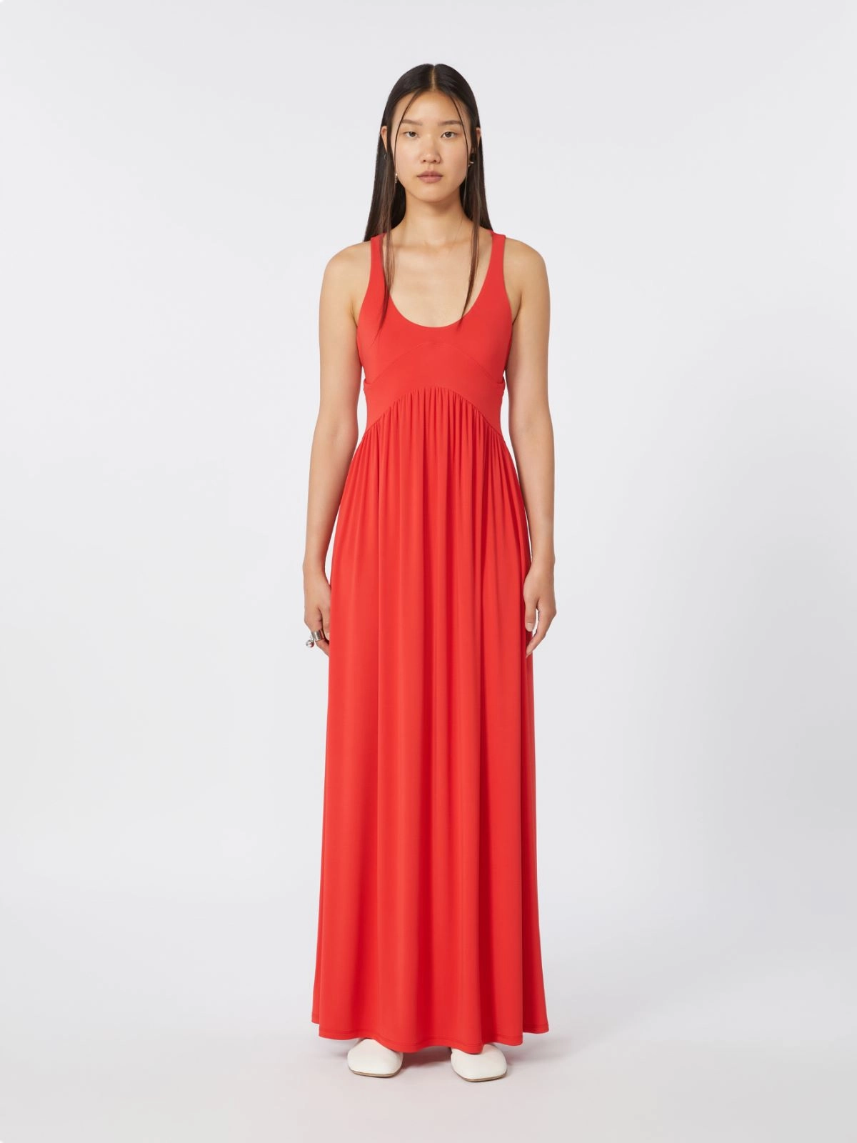Long crepe jersey dress with a rounded neckline and spaghetti straps. The rounded seams on the bodice create a shaped opening at the back and a gathering on the skirt.