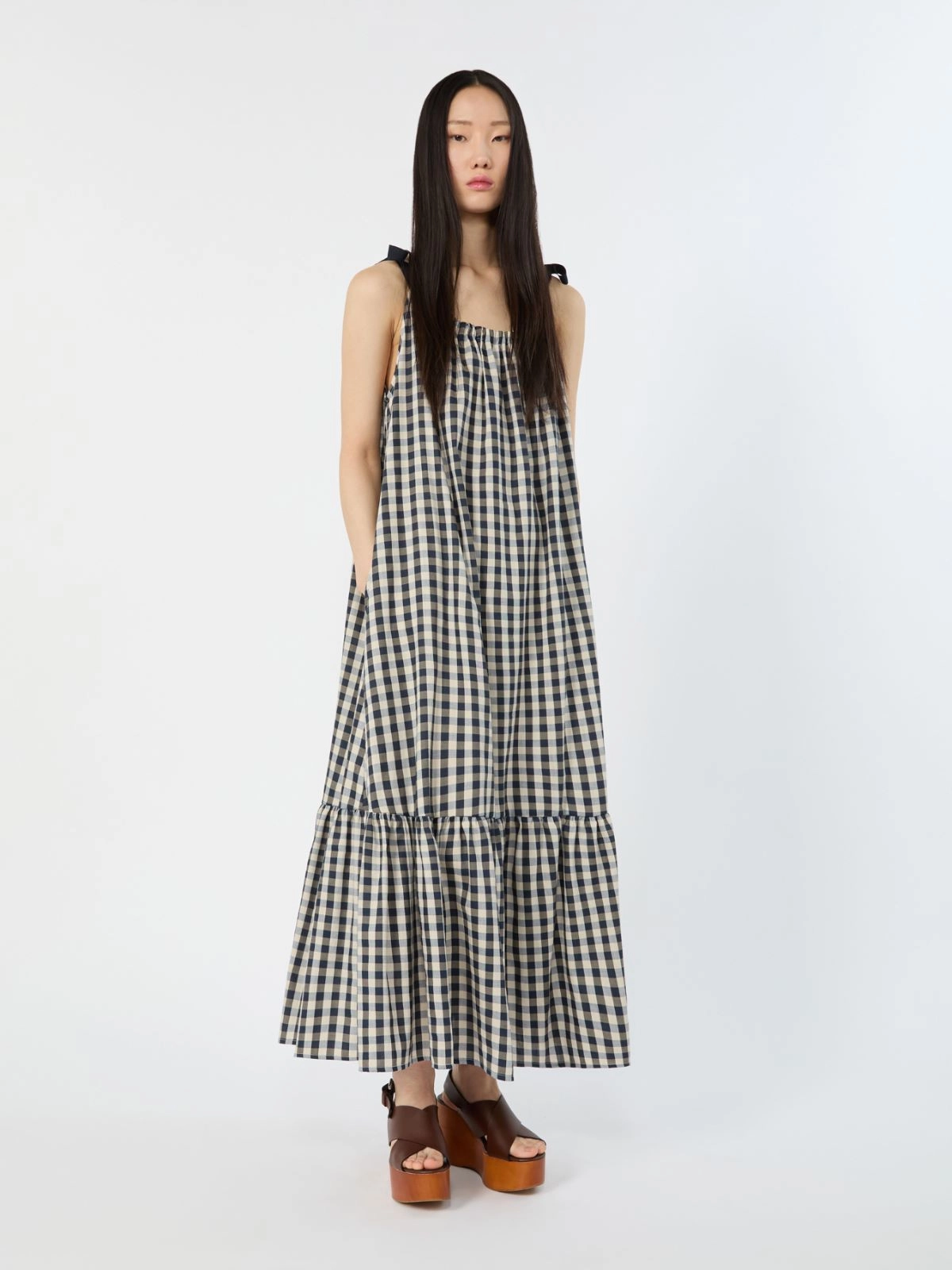 Long sleeveless dress with ample volume, offered in a Vichy checked pattern. This garment is part of the Mediterranean Ease capsule collection.