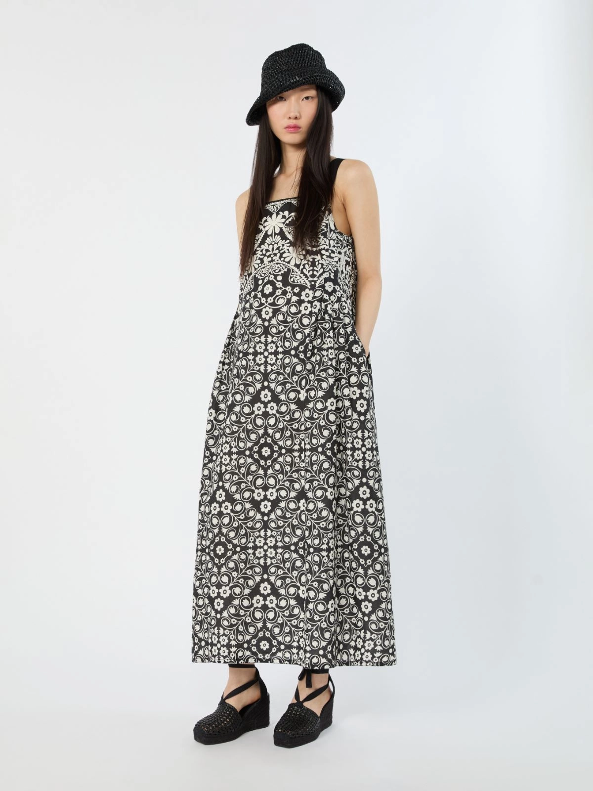 Long sleeveless dress with all-over printed collection pattern, soft bodice, and straight skirt. This garment is part of the Mediterranean Ease capsule collection.