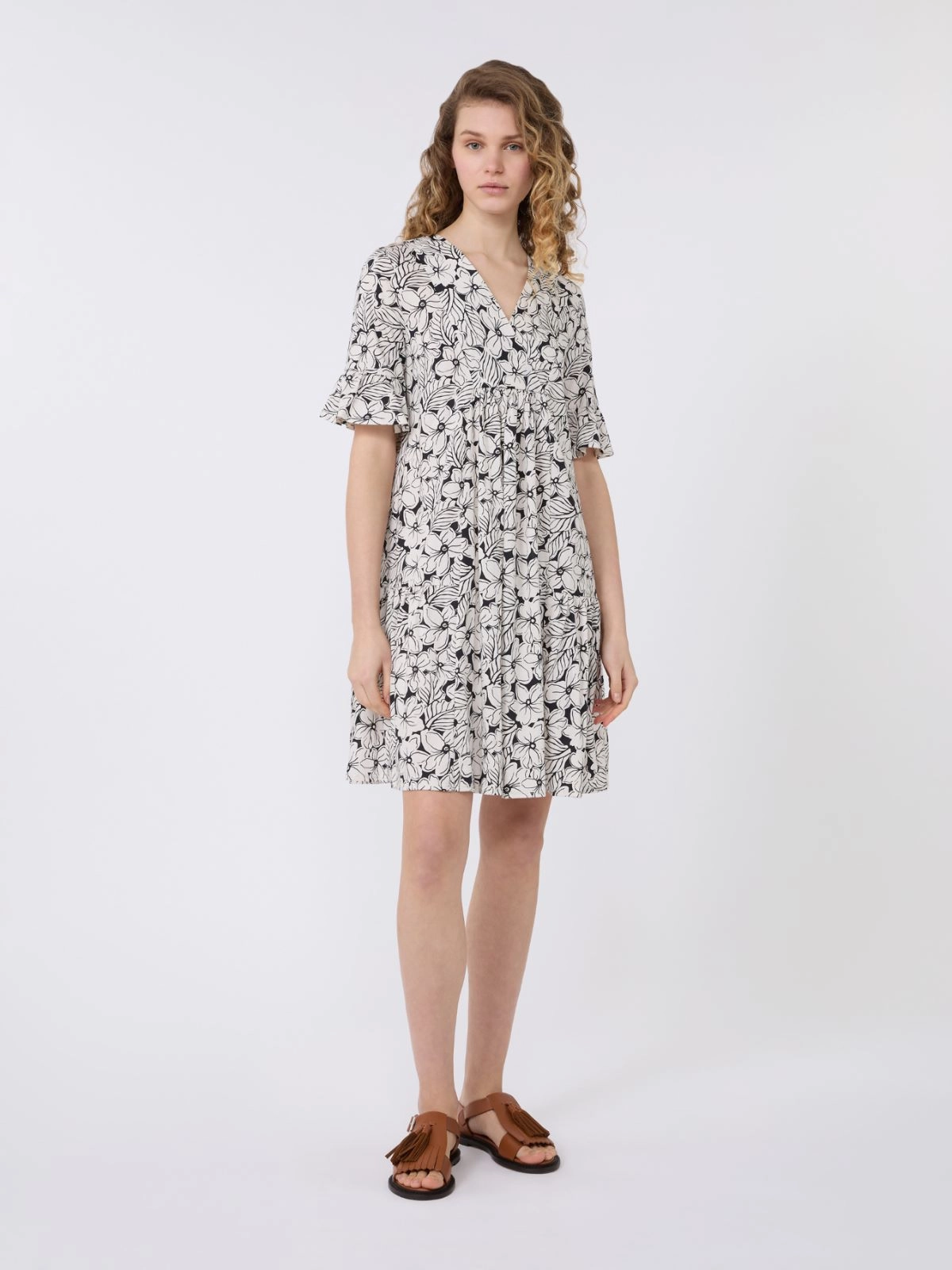 Short kaftan dress with flounced skirt and all-over printed collection motif.
