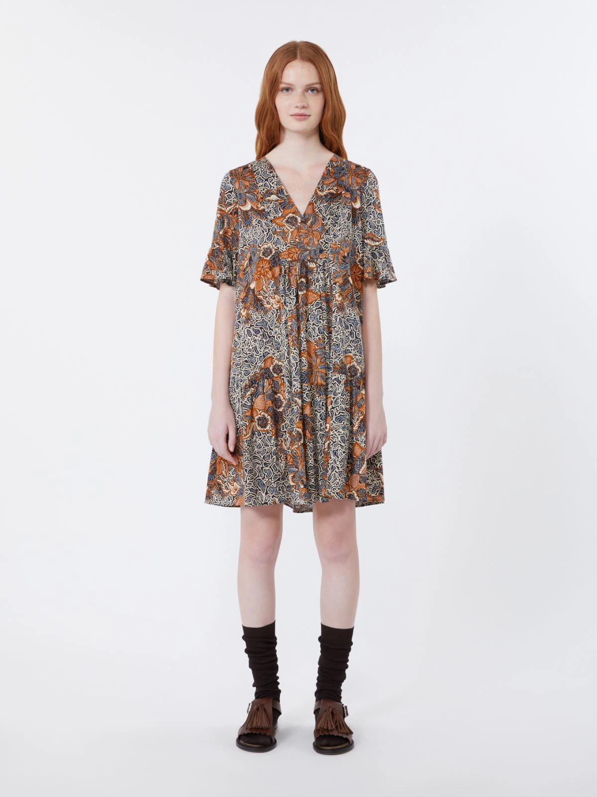 Short kaftan dress with flounced skirt and all-over printed collection motif.