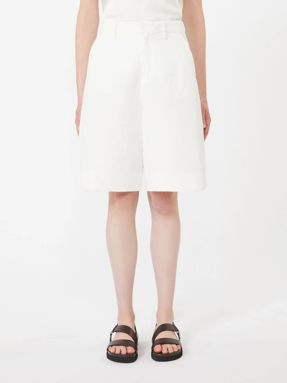 - High-cut waistband with a fly-covered zip and hook-and-bar fastening