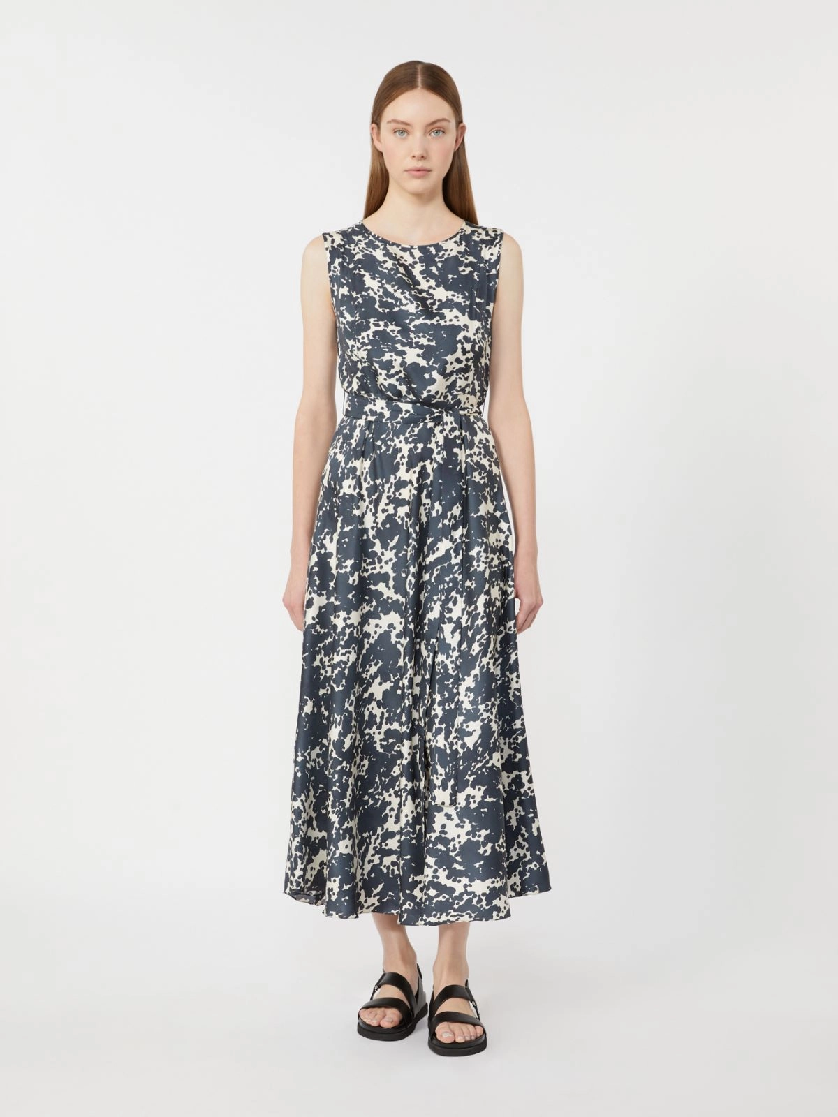Long sleeveless dress with waist seam and slightly flared skirt.