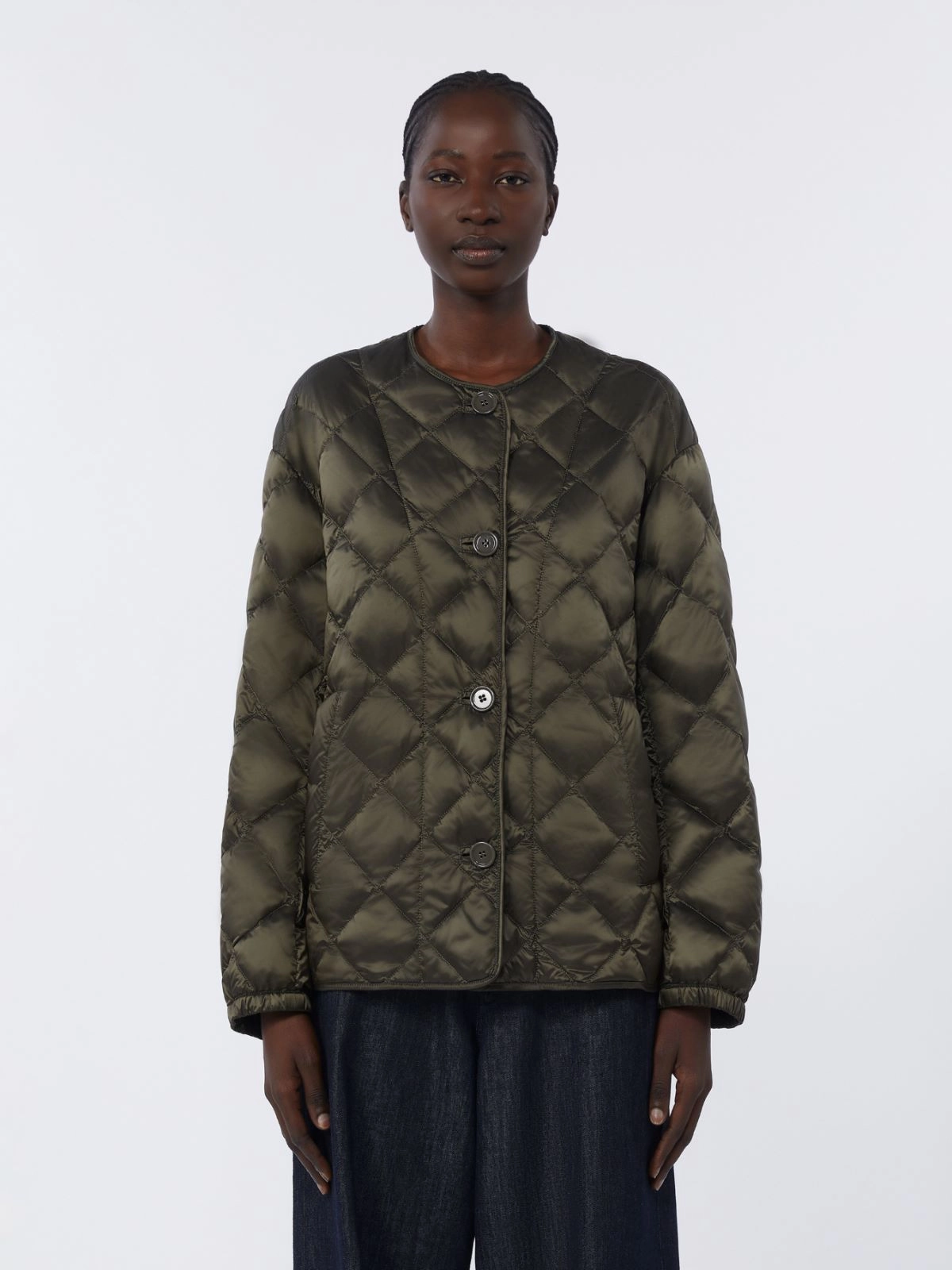 Short round-neck down jacket with all-over diamond-patterned quilting.